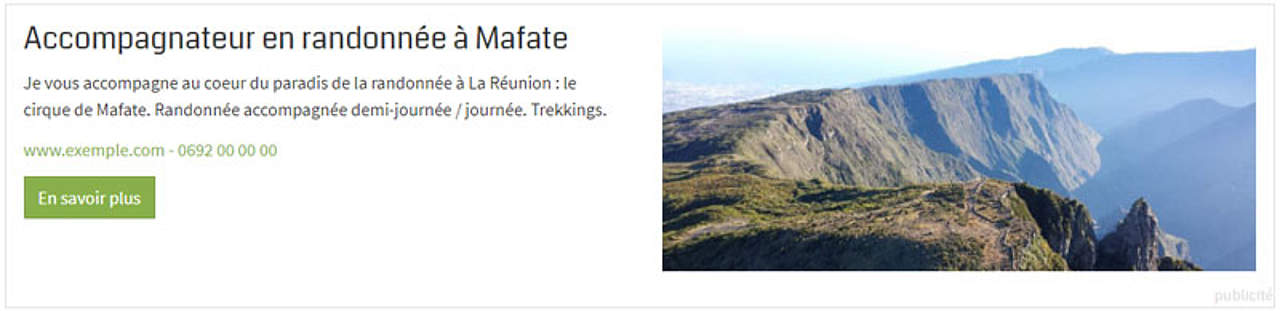 Que vous souhaitiez augmenter votre visibilité ou votre référencement (ou les deux !), nous avons une solution à vous proposer à condition que votre activité ait un lien avec le cirque de Mafate, la randonnée et/ou La Réunion.